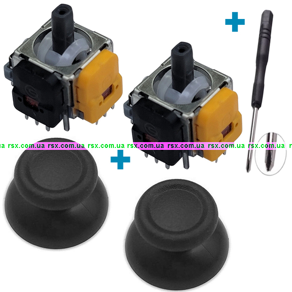 Аналоговий стик 3D механізм Dualshock 4 PS4 V2 Hall Effect (з датчиком холла) комплект із 2-х штук механізмів + стики чорні 2 шт + викрутка.